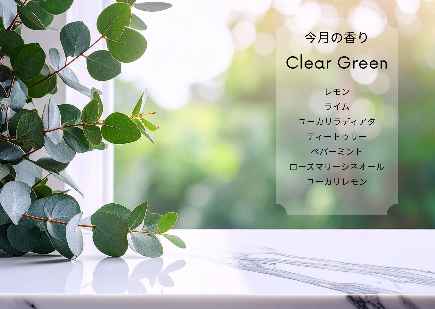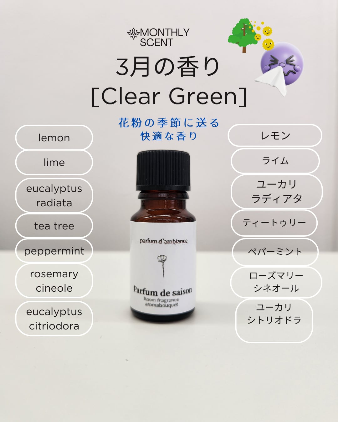 春の始まりを感じる、みずみずしいグリーンの香り。花粉の季節にゆらぎがちな呼吸をやさしく整え、気持ちまでクリアに。新しい季節を軽やかに迎えるための