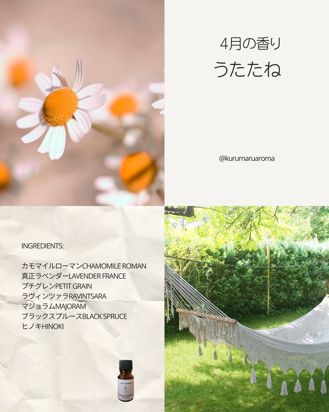 4月の香り「うたたね」心地よい眠りへと誘う、優しいブレンドオイルです。忙しい日々の合間に、たった5分の深呼吸で、まるで“うたたね”を楽しむかのように、心と体をやさしく整えてくれます。穏やかな香りで、内側からリラックスする時間をお届けします。